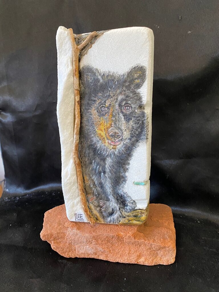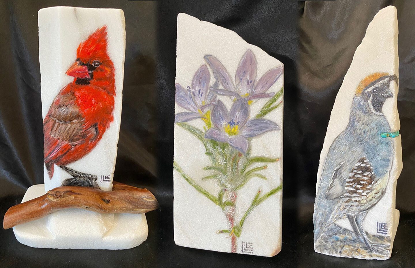 Lifestyle changes, moving from Illinois to Colorado and raising three boys altered my art. Then I had the opportunity to tour the Yule Marble Quarry. I traded my regular canvas for this stunning pure white marble. It has allowed me to expand into my “Art on Marble” using all aspects of this beautiful stone. My favorite subjects for oil painting include wildlife and the scenic mountain beauty of Colorado and the desert raw picturesque areas of Arizona. These places give